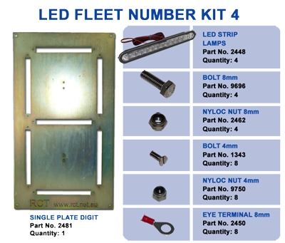 Number kits (0-9) are supplied with a single plate, the correct quantity of red 24V LED strip lamps, electrical terminals and mounting bolts for both the plate itself and the LED strip lamps.