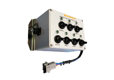 The system has 6 spray head outputs for individual control, auto/manual function switch, 3 adjustable speed settings, one shot pulse and an adjustable constant pulse setting. The controller has been designed to interface into an OEM mobile water truck control panel.